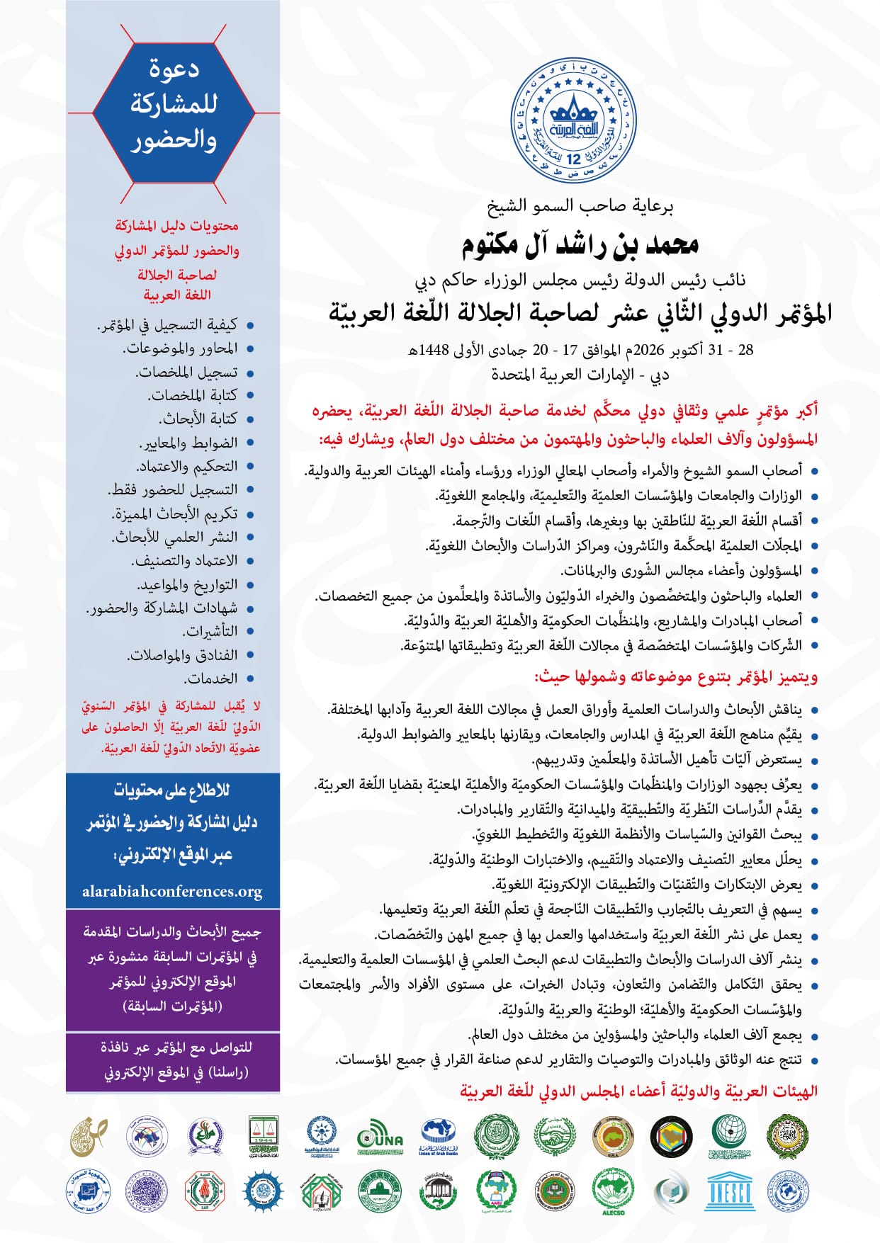 المؤتمر الدولي الثاني عشر لصاحبة الجلالة اللغة العربية 28 - 31 أكتوبر 2026م الموافق 17 - 20 جمادى الأولى 1448ه دليل المشاركة والحضور للمؤتمر الدولي لصاحبة الجلالة اللغة العربية (للتصفح) دليل المشاركة والحضور للمؤتمر الدولي لصاحبة الجلالة اللغة العربية للتحميل (PDF) التسجيل للمشاركة ببحث أو ورقة عمل التسجيل للحضور فقط لا يُقبل للمشاركة في المؤتمر السّنويّ الدّوليّ للّغة العربيّة إلّا الحاصلون على عضويّة الاتّحاد الدّوليّ للّغة العربيّة. الضغط هنا لتسجيل العضوية في الاتحاد الدولي للغة العربية المؤتمر الدولي الحادي عشر للغة العربية البيان الختامي للمؤتمر الدولي الحادي عشر للغة العربية - الضغط هنا قائمة الأبحاث الفائزة - الضغط هنا المؤتمر الدولي العاشر للغة العربية تحميل البيان الختامي للمؤتمر الدولي العاشر للغة العربية تحميل قائمة الأبحاث المميزة الفائزة في المؤتمر الدولي العاشر للغة العربية تحميل الوثيقة العربية للأمن الوطني واللغوي في الدول العربية تحميل البيان الختامي والتوصيات (PDF) للتواصل مع المؤتمر راسلنا مباشرة أرسل