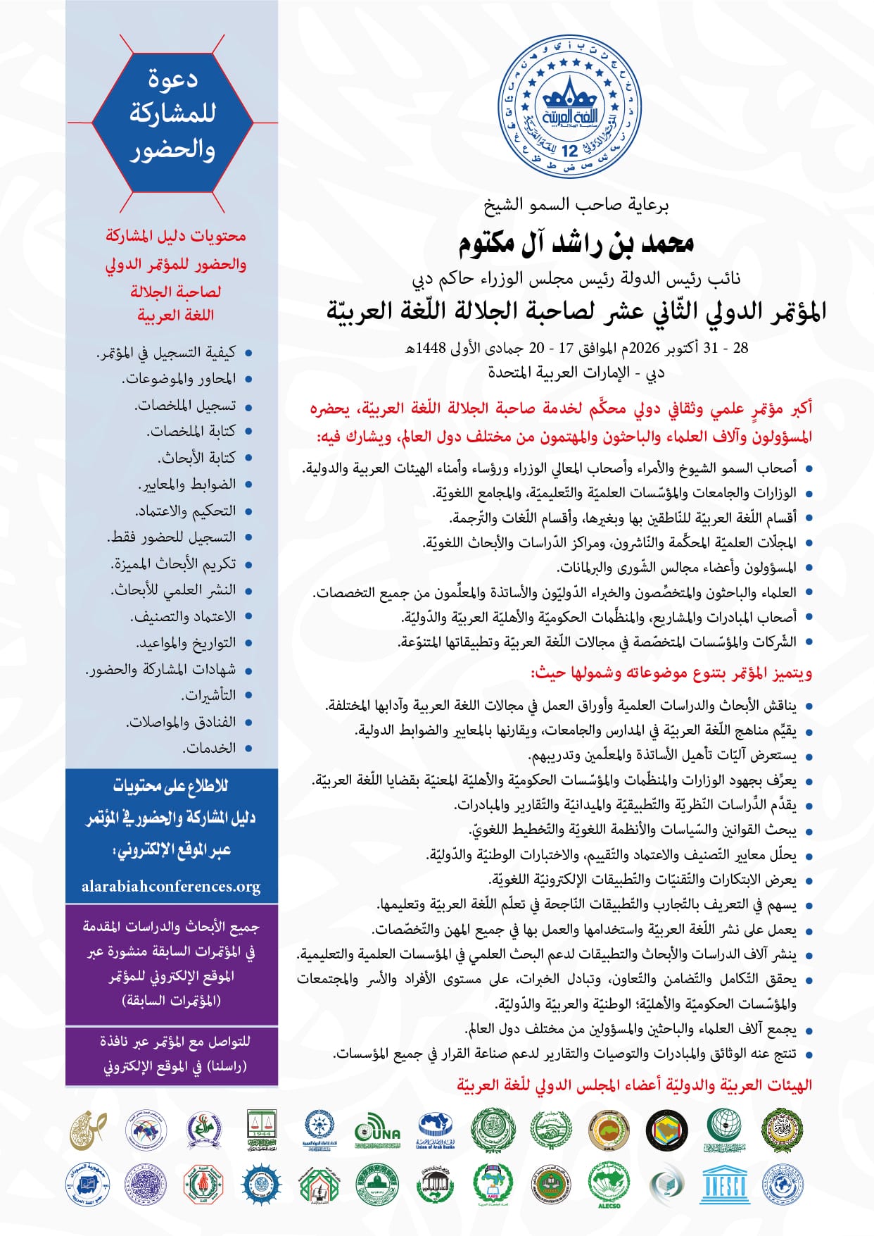 المؤتمر الدولي الثاني عشر لصاحبة الجلالة اللغة العربية 28 - 31 أكتوبر 2026م الموافق 17 - 20 جمادى الأولى 1448ه دليل المشاركة والحضور للمؤتمر الدولي لصاحبة الجلالة اللغة العربية (للتصفح) دليل المشاركة والحضور للمؤتمر الدولي لصاحبة الجلالة اللغة العربية للتحميل (PDF) التسجيل للمشاركة ببحث أو ورقة عمل التسجيل للحضور فقط المؤتمر الدولي الحادي عشر للغة العربية البيان الختامي للمؤتمر الدولي الحادي عشر للغة العربية - الضغط هنا قائمة الأبحاث الفائزة - الضغط هنا المؤتمر الدولي العاشر للغة العربية تحميل البيان الختامي للمؤتمر الدولي العاشر للغة العربية تحميل قائمة الأبحاث المميزة الفائزة في المؤتمر الدولي العاشر للغة العربية تحميل الوثيقة العربية للأمن الوطني واللغوي في الدول العربية تحميل البيان الختامي والتوصيات (PDF) للتواصل مع المؤتمر راسلنا مباشرة أرسل
